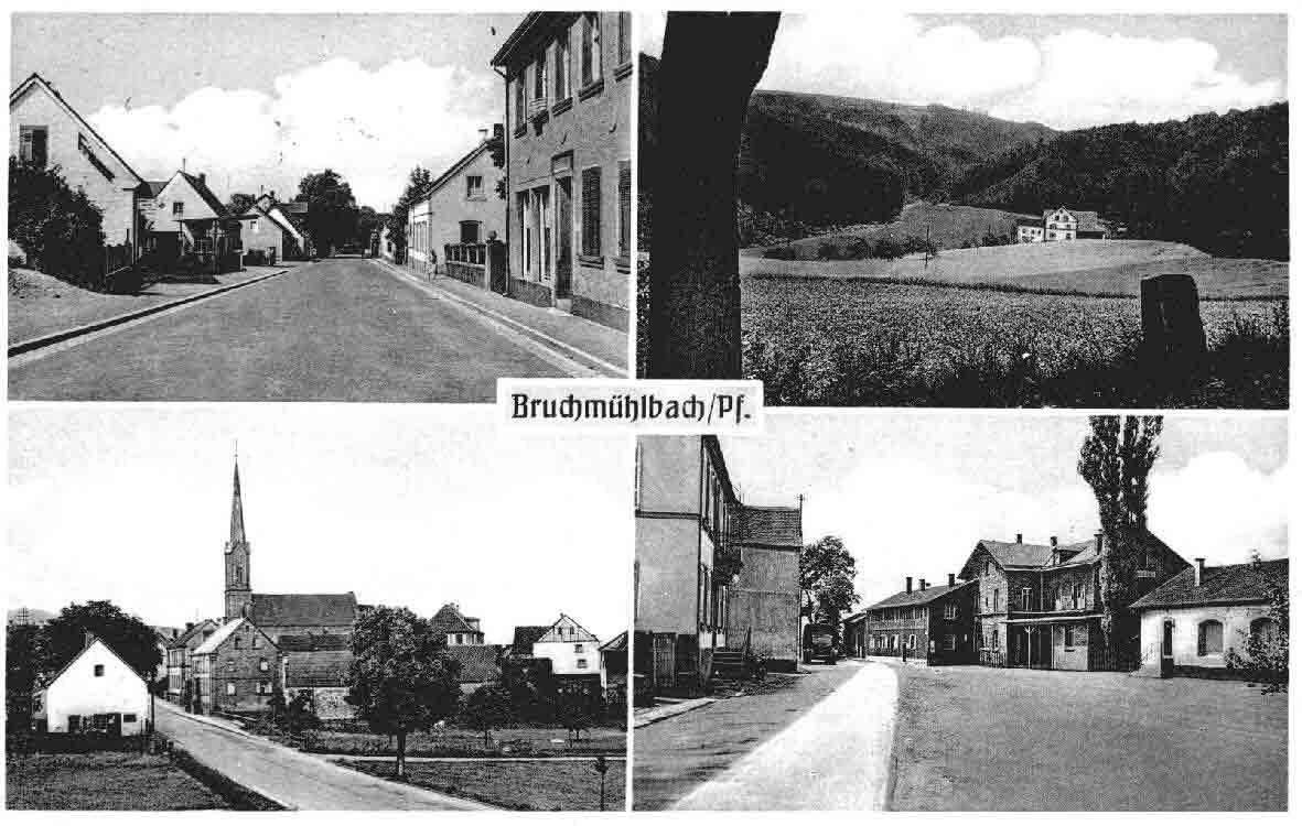 Diese Mehrbildkarte wurde 1952 verschickt. Die Aufnahmen finden sich in den verschiedensten Varianten auf mehreren Ansichtskarten dieser Zeit. Herausgeber der Karte Urban Schneider, Damen und Herren Friseurgeschäft in Bruchmühlbach.