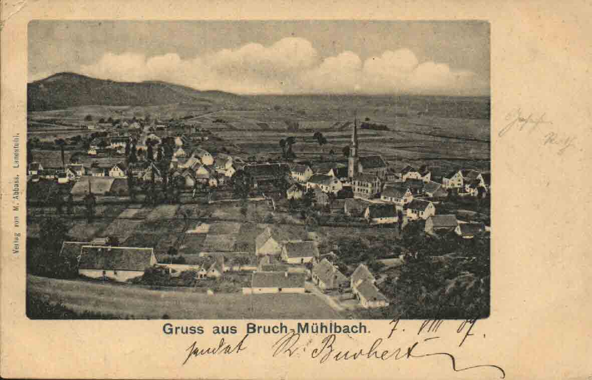 Diese Karte trägt das gleiche Foto wie das Beispiel auf der vorhergehenden Seite, jedoch wurde die Schrift moderner gestaltet. Gelaufen ist diese Karte 1907, von Bruchmühlbach nach Zweibrücken geschickt.