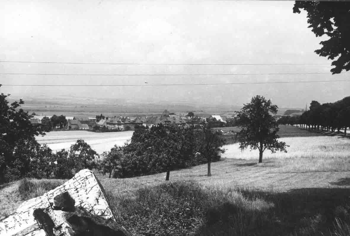 Eine Aufnahme von Bruchmühlbach aus dem Jahr 1950. Rechts mit Bäumen gesäumt, die Straße nach Lambsborn. Im Vordergrund ein Teil der Panzersperre.