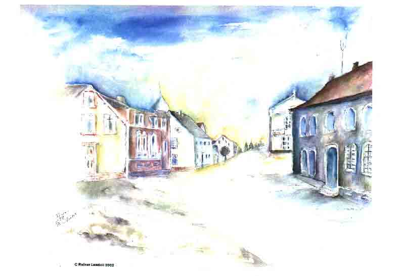 Diese moderne Künstlerkarte wurde 2002 von Rainer Landoll gestaltet. Das Aquarell zeigt den Beginn der Hütschenhauser Straße um 1930.