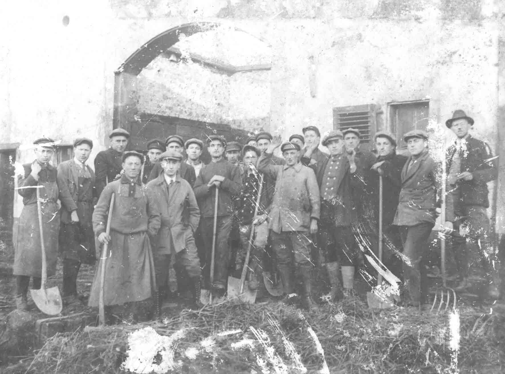 Diese Aufnahme ist ca. 1925 vor dem Anwesen Woll in der Bahnhofstrasse 7entstanden. Es könnte sich um die Baukolonne handeln, die in dieser Zeit die Scheune erweitert hat.