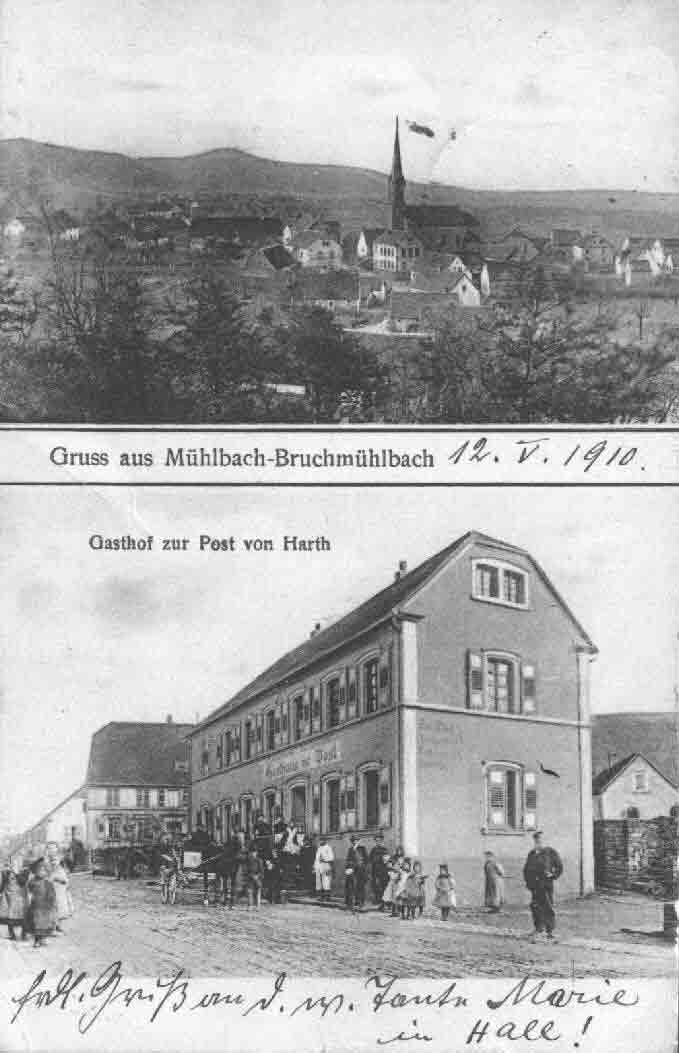 Die alte Poststation im Jahr 1910. Zu dieser Zeit fuhr noch die Postkutsche durch Bruchmühlbach. Auch waren die Orte Mühlbach im Bruch und Bruchmühlbach noch getrennt.