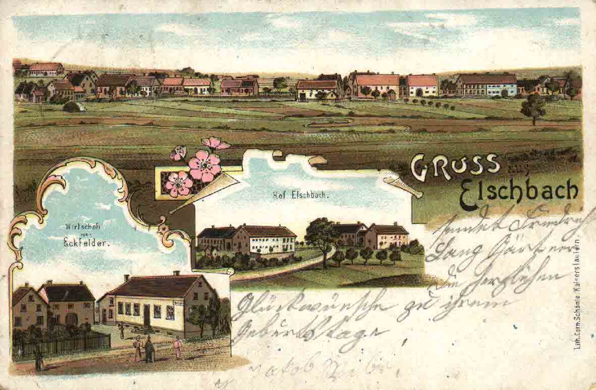 Um 1900 war Elschbach noch sehr überschaubar. Die Karte wurde wahrscheinlich in der Gastwirtschaft Eckfelder (unten links) verkauft. Herausgeber war Herr Munzinger aus Miesau.