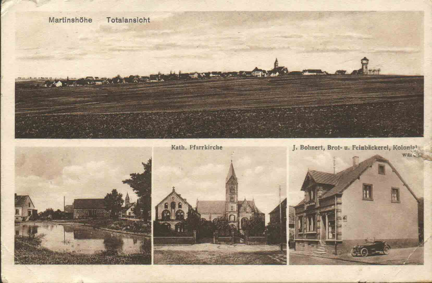 Diese Mehrbildkarte ist um 1920 entstanden. Der alte Wasserturm steht noch frei am Ortseingang. Ein weiteres schönes Detail ist der "Sportwagen" neben dem Kolonialwarengeschäft.