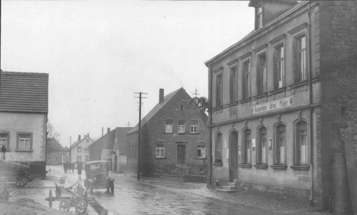 Die St. Wendeler Straße im Jahr 1938. Rechts das ehemalige Gasthaus Alfred Müller (Pannekuche). Weiter im Verlauf der Straße der Kolonialwarenladen von Alfred Ginkel (heute Elektro Fuchs).