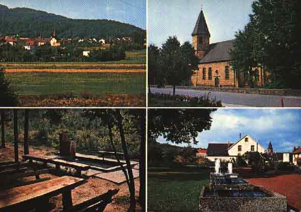 Mehrbildkarte um 1980. Links oben, Vogelbach aus der Richtung der Autobahn, rechts oben die Simultankirche. Unten die Vogelquelle und der neue Dorfbrunnen. Diese Karte vor von Herrn Schoon aus Vogelbach gestaltet und verlegt.
